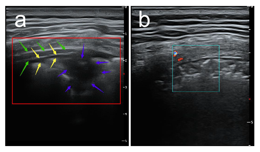 7. CDFI超声显示非重症期新型冠状病毒肺炎(COVID-19)患者胸膜下实变病灶血流信号不敏感,随更换多台不同品牌新型超声仪器仍显示呈乏血流表现,具体原因可能与病变的病理性质有关,同时与病变进展时期有关,但应引起高度重视,因普通炎症所致肺实变彩色多普勒超声显示呈丰富血流信号,一般预后较好但新型冠状病毒肺炎(COVID-19)患者病变一般进展迅速,引起患者死亡,是否与肺组织未能迅速建立起丰富微小血管交换机制相关还有待于进一步研究,但值得肯定的是彩色多普勒超声相比其他医疗设备更能有效直观的了解实变肺组织血供信息,对临床医生预先判断患者预后及病情进程有重要的临床价值。