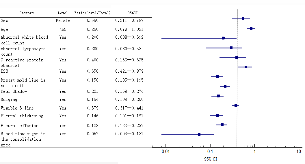 2、 通过对各个部位病变类型进行分析,病变部位可见到B线比例高于其他病变表现,95%CI为0.317-0.441。存在血流征象比例较小,其95%CI为0.008-0.121。具体结果详见下图。