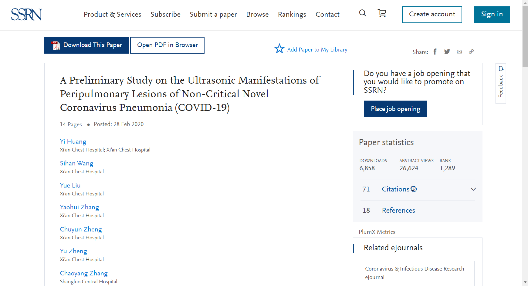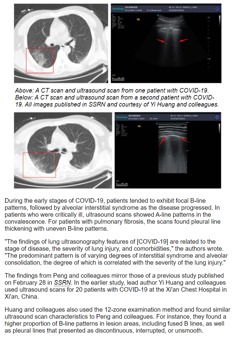 日前,一篇题为Ultrasound can be used for patients with COVID-19的报道在美国著名影像学论坛AuntMinnie.com发表。特约撰稿人Theresa Pablos在文章中写到:2020年2月28日,西安市胸科医院黄毅团队《A Preliminary Study onthe Ultrasonic Manifestations of Peripulmonary Lesions of Non-Critical Novel Coronavirus Pneumonia (COVID-19)》的预印本论文上线SSRN网站平台,在全球范围内率先公布了新型冠状病毒肺炎肺周病变超声表现。