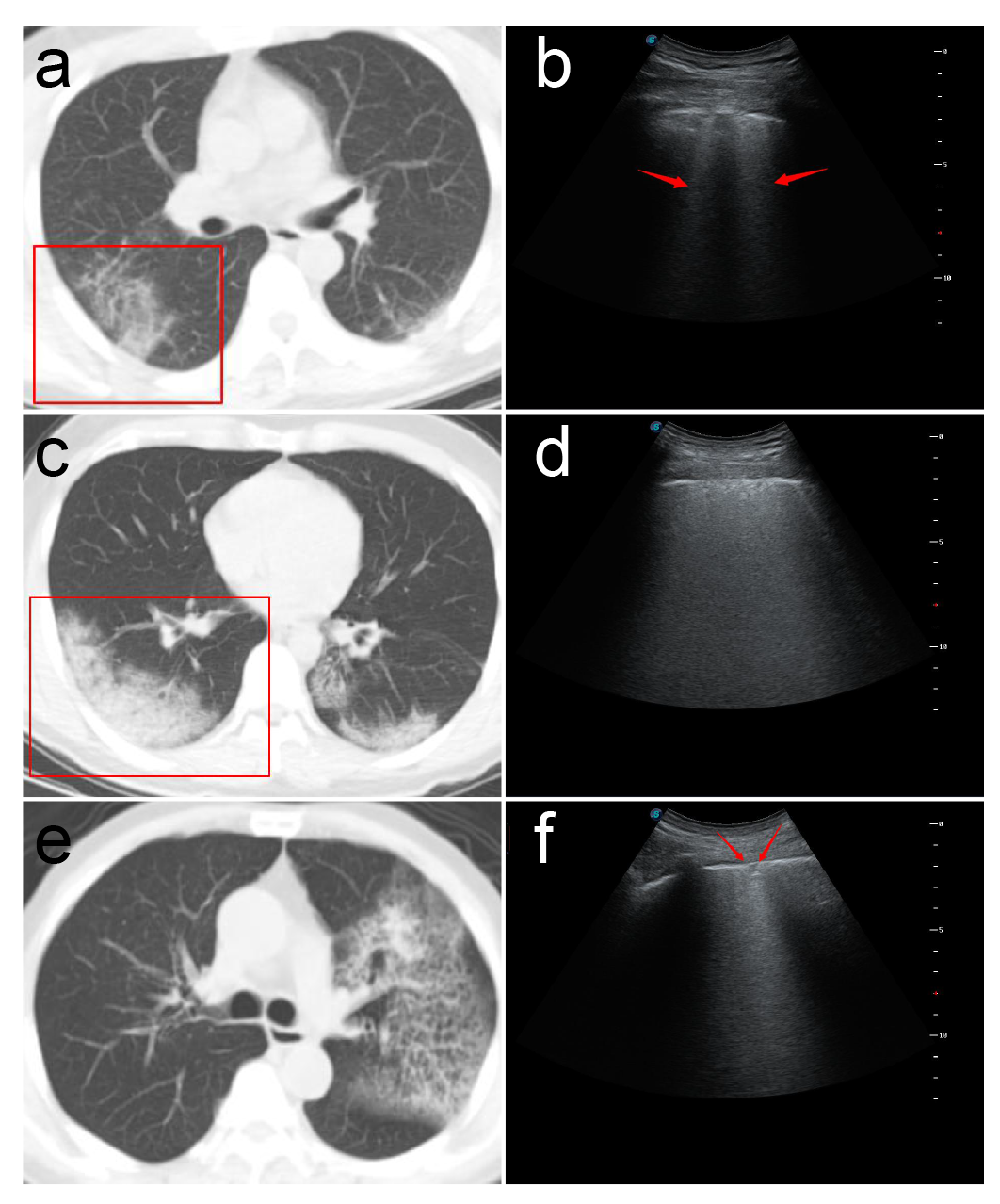 2.超声探查可见胸膜线下多条不连续或连续融合B线(瀑布征),或弥漫性B线(白肺征),同时A线消失。与心源性肺水肿所致B线比较,冠肺B线融合现象更普遍,位置相对也比较固定,B线边缘模糊,无分叉征,起点位于胸膜下病灶较肺水肿B线起点圆钝(凸阵探头)。