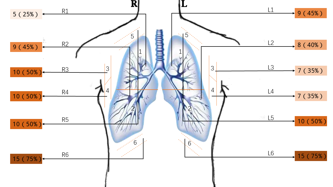 1、 共20例患者被纳入本研究,其中双肺多发病灶选取最大者观察,男11例,女9例,年龄27-81岁,年龄中位数44.5,≥65岁3例,<65岁17例。通过超声对患者肺脏左右各6个肺野12个肺区域存在病变数量进行统计,可以看到不同肺区病变数量。具体结果见下图。