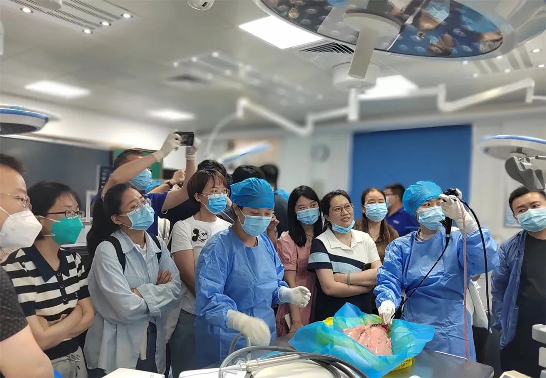 专家授课结束后,专家还现场对学员们进行实操讲解培训,冯宇鹏教授组织大家对人体解剖实体观摩并进行讲解,李凤娟医生指导、刘英护士配合,向大家进行普通支气管镜基础操作(灌洗、活检)的手把手教学,蔡华峰医生指导、赵航护士配合,向大家进行呼吸内镜诊疗技术(冷冻肺活检、支气管球囊扩的手把手教学,实操环节让大家真正学会技能。