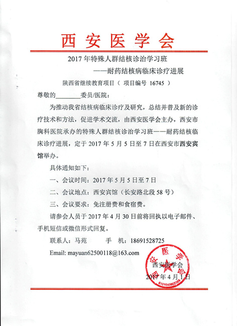 西安市胸科医院于5月5-7日在西安宾馆举办“耐药结核病临床诊疗进展学习班(陕西省继续教育项目,项目编号16745)诚邀您参会