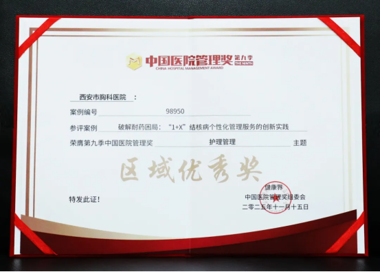 护理部申报的破解耐药困局:“1+X”结核病个性化管理服务的创新实践,获评“护理管理优秀案例”。该方案精准聚焦耐药结核病管理这一全球性难题,探索形成个性化、全流程的服务新模式,为临床破解耐药防治困境提供了具有参考价值的实践路径。