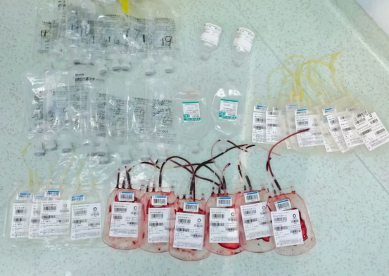 这是一场对术者技术、毅力和心理的极限考验。韦林主任医师、汪林宝副主任医师、李楠楠副主任医师精细操作,粘连分离呈毫米级推进,每一刀都精准避开致命血管。术室内,监护仪的滴答声与电凝止血的“滋滋”声交织成紧张的交响。由于创面巨大,患者术中出血量高达4000毫升。麻醉医生与手术室护士紧密配合,快速建立输血通道,共输注红细胞12个单位、新鲜冰冻血浆800毫升、冷沉淀25个单位,相当于将全身血液置换了80%。