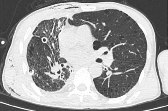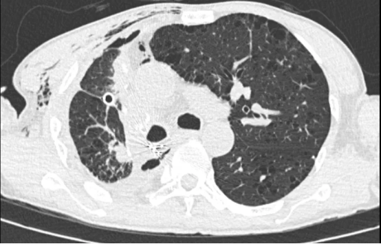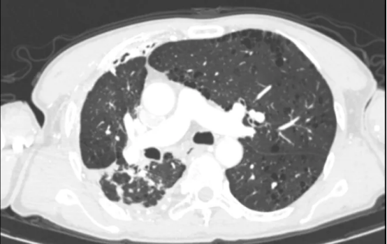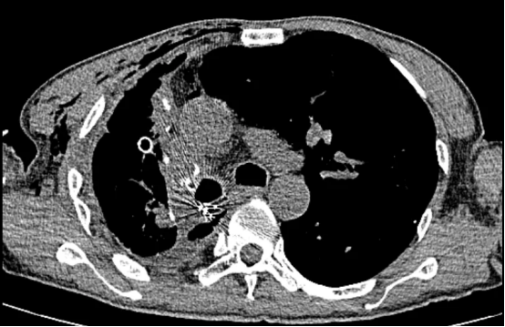 该患者为61岁男性,肺部病情错综复杂。4年前确诊肺结核后因治疗不规范,发展为“利福平耐药”结核,病情持续恶化。2年来反复咯血,虽经3次支气管动脉栓塞术暂时控制,但病灶顽固,收治入院时已形成多重诊断:毁损肺(右上)、右肺下叶鳞癌(背段)、肺曲霉菌病、陈旧性肺结核。其右肺上叶完全丧失功能,并与胸壁形成致密粘连,医学上称为“毁损肺”——胸外科领域公认的极高难度手术。
