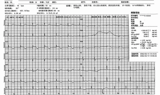该患者为老年女性,因持续胸闷、胸痛,心肌标志物显著升高,心电图提示急性下壁ST段抬高型心肌梗死,经120送入我院急诊科,心内科尚粉青主任医师会诊后迅速判断该患者为急性下壁ST段抬高型心肌梗死,需要立刻安排急诊介入手术开通闭塞血管,立即口服术前用药,一键启动导管室。