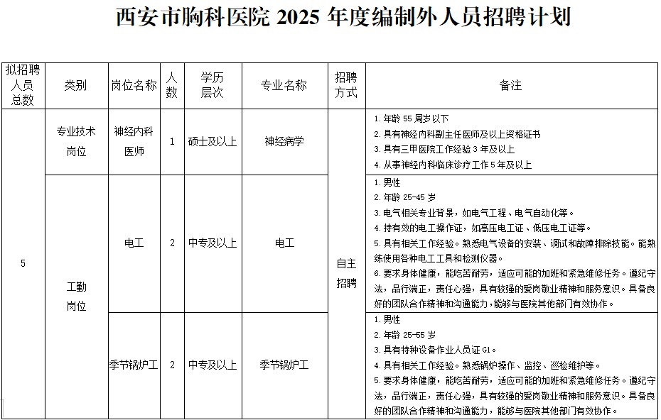 根据我院发展需要,本次招聘均为编制外招聘,招聘5名编制外聘用人员。具体招聘专业岗位及数量要求见《西安市胸科医院2025年度编制外人员招聘计划》。
