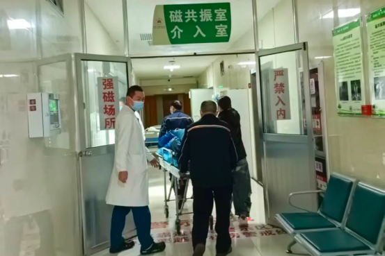 患者管理中心李白宁主任闻讯即动,迅速联系120急救站。孙黎博主任一边调派救护车,一边与家属沟通病情。急救团队抵达现场后,立即完成心电图检查,并将结果实时传至“胸痛患者沟通群”。心内一科学科带头人张科林主任、副主任尚粉青结合心电图检查结果远程研判,初步判断患者为急性广泛前壁心肌梗死,随即指令给予“双抗”治疗,并通知介入室做好随时开展介入治疗的各项准备工作。