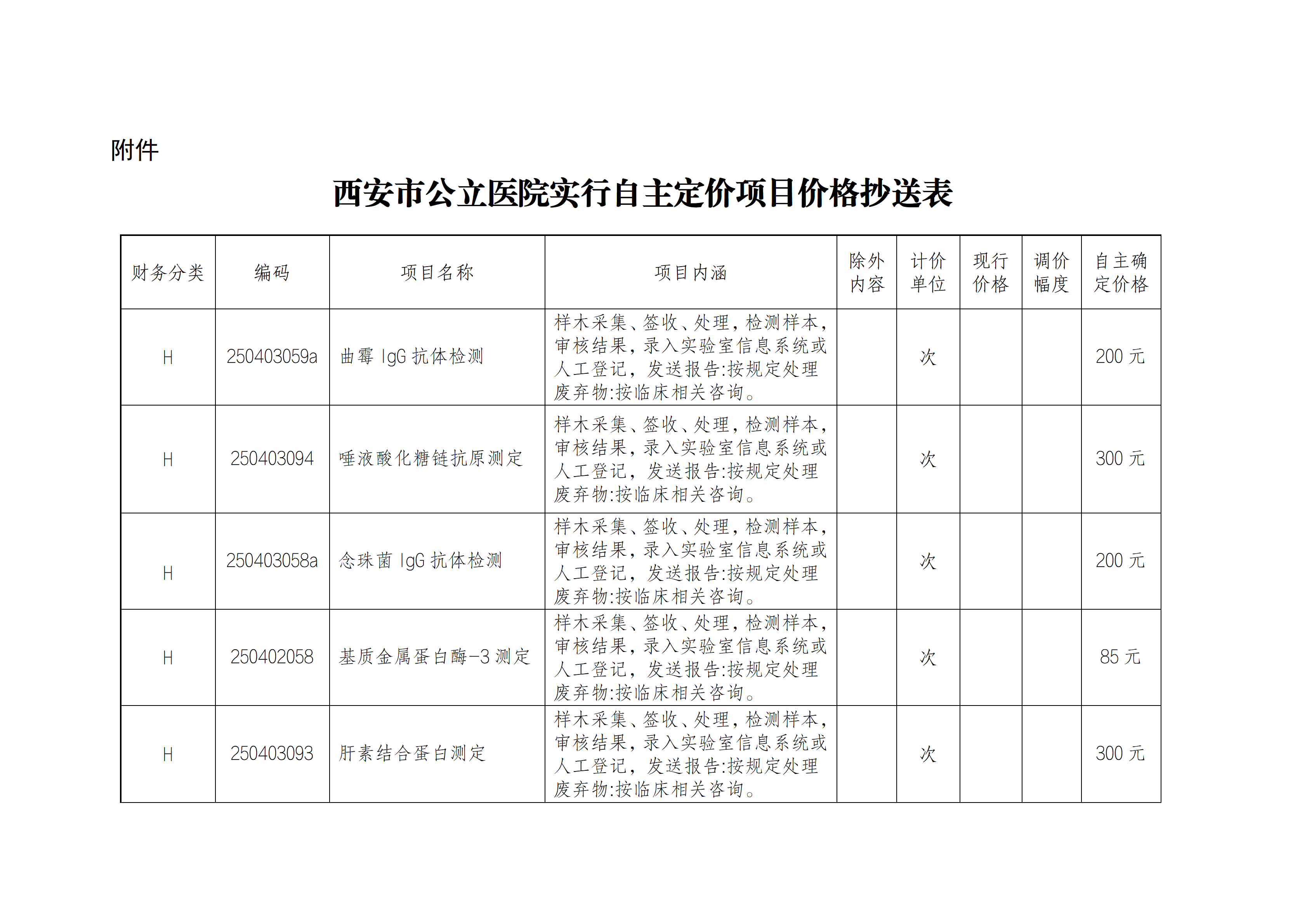 依据《陕西省医疗保障局关于新增修订部分医疗服务价格项目的通知》(陕医保发〔2023〕33号)明确,检验项目中的曲霉IgG抗体检测、唾液酸化糖链抗原测定、念珠菌IgG抗体检测、基质金属蛋白酶-3测定、肝素结合蛋白测定等5项医疗服务项目价格实行自主定价,收费标准由医院自主确定。现对这5项医疗服务项目价格予以公示,具体情况见附件。
