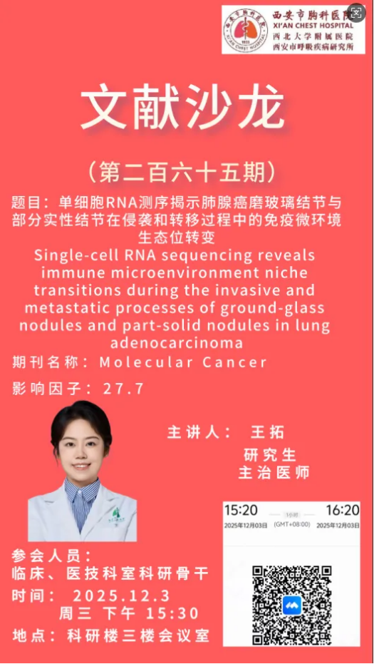 近日,西安市胸科医院呼吸与危重症医学科李建英导师团队主办的“快乐呼吸文献沙龙”圆满完成了本年度的学术活动。全年共举办71期沙龙,以系统化、高质量的文献研读与研讨,为全院医务人员及学生搭建起持续互动的学术交流平台,有效促进了科研能力提升与临床实践创新。