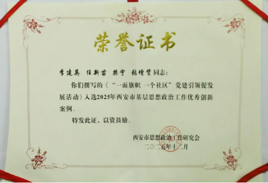 近日,由西安市委宣传部批准、西安市思想政治工作研究会组织开展的2025年基层思想政治工作创新案例遴选结果正式公布。西安市胸科医院李建英、任新苗、樊宇、张增贤四位同志撰写的《“一面旗帜一个社区”党建引领促发展活动》荣获“西安市基层思想政治工作优秀创新案例”称号。充分彰显了我院在基层思政工作中的创新探索与实践成效。