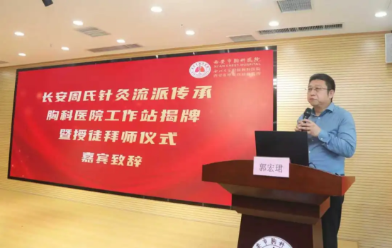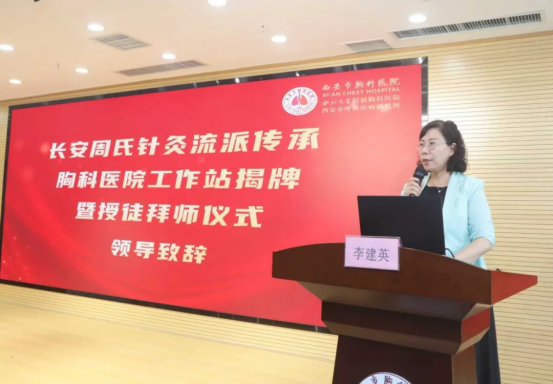 李建英院长在致辞中表示,工作站的成立是医院中医药事业发展的重要里程碑。她指出,长安周氏针灸流派在调理气血、扶正祛邪、改善症状及提升患者生活质量等方面展现出显著优势。她对工作站提出三点期望:一是建设成为学术高地,深入整理、研究和传承周氏针灸流派的学术精髓;二是打造为服务患者的重要平台,积极推动针灸技术在胸科疾病治疗与康复中的应用;三是构筑人才培育摇篮,通过师承模式培养兼具现代医学知识与传统针灸技艺的复合型人才。