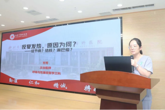 68岁女性,间断发热2月,门诊PPD阳性。胸部增强CT提示双肺多发微小结节、淋巴结肿大及副脾。淋巴结穿刺病理见增生淋巴组织伴炭末沉积及炎细胞浸润。当前诊断为脓毒血症、SIRS、多器官功能不全及淋巴结肿大等。讨论围绕发热与淋巴结肿大病因,是否行PET-CT、淋巴结切除活检及病理会诊展开。